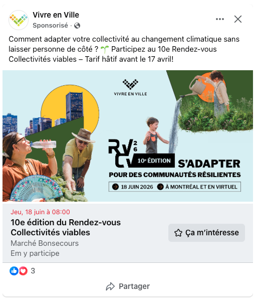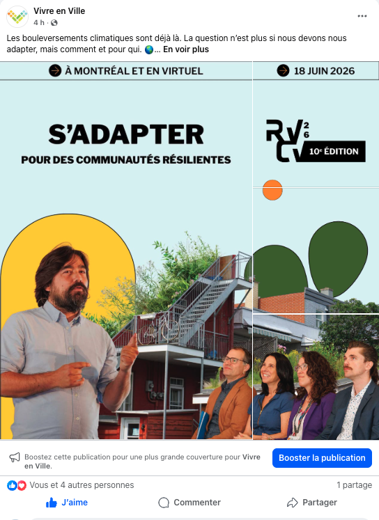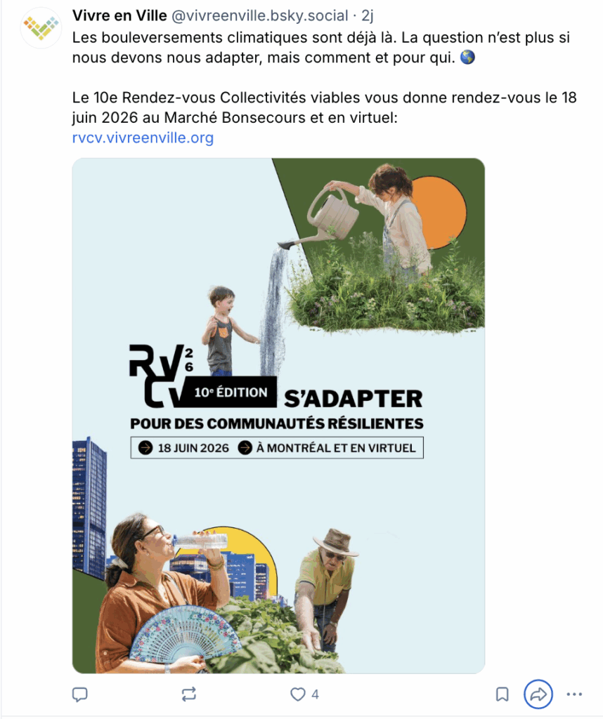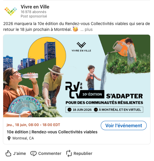 Pour sa 10e édition, le Rendez-vous Collectivités viables de @vivre_en_ville vous donne rendez-vous le 18 juin 2026 au Marché Bonsecours et en virtuel pour placer l’adaptation climatique équitable au cœur de l’action.